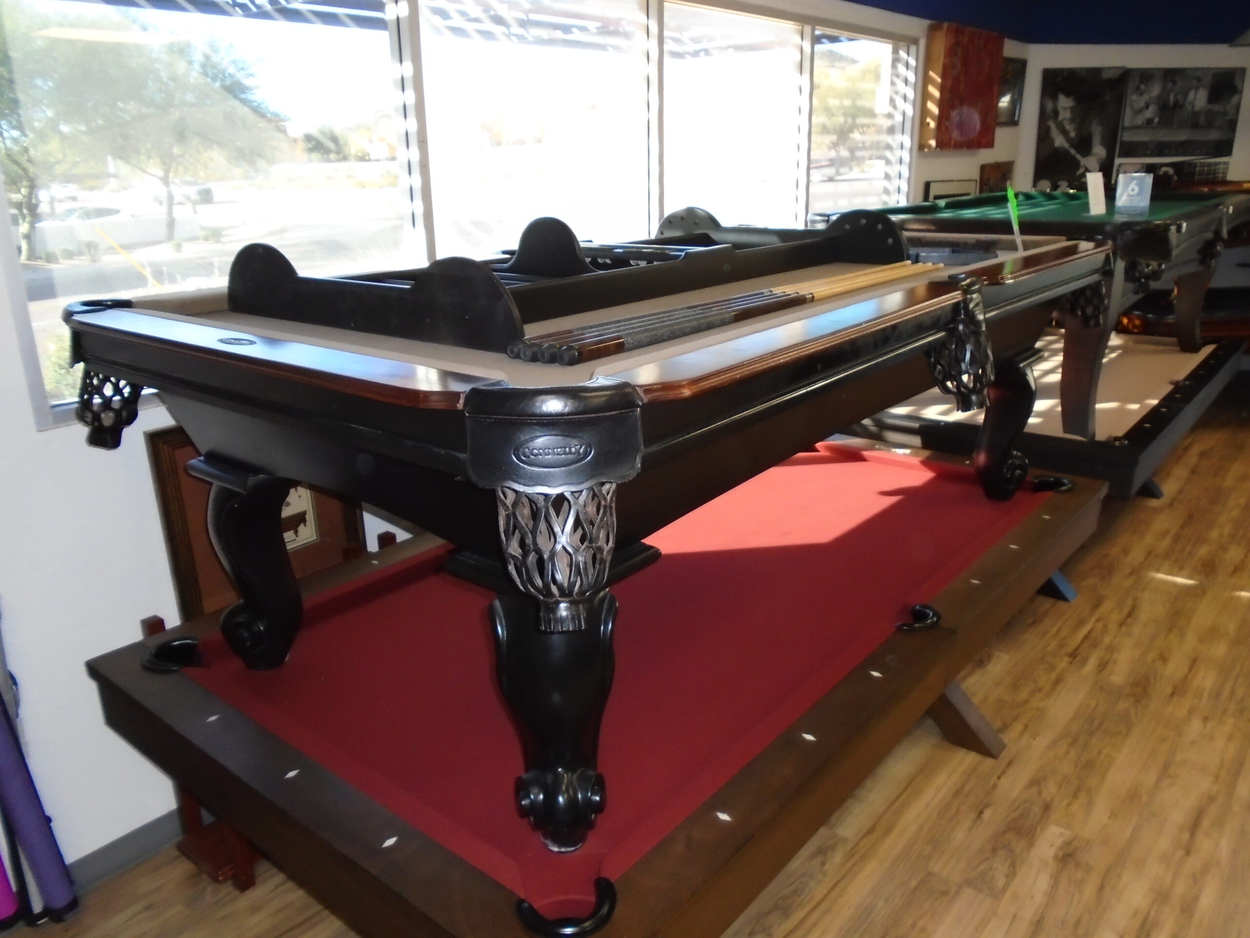 8′ Connelly Prescott pool table made in the USA. Part of Connelly’s Pinnacle series it comes with the following features. Three piece 1.25 ” wood backed slate. Icon 100% gum rubber cushions guaranteed to never need replacing. Solid Maple rails, cabinet and legs in a 2 Tone Black, Pecan finish. Wide rails for hand comfort and cue stability. Ebony diamond sights. Leather shield pockets with the Connelly logo stamped into the shield. Accessories included are over 1K in added value, 4 original Connelly cues, one piece matching wall rack, Aramith Super Pro Belgium made balls.